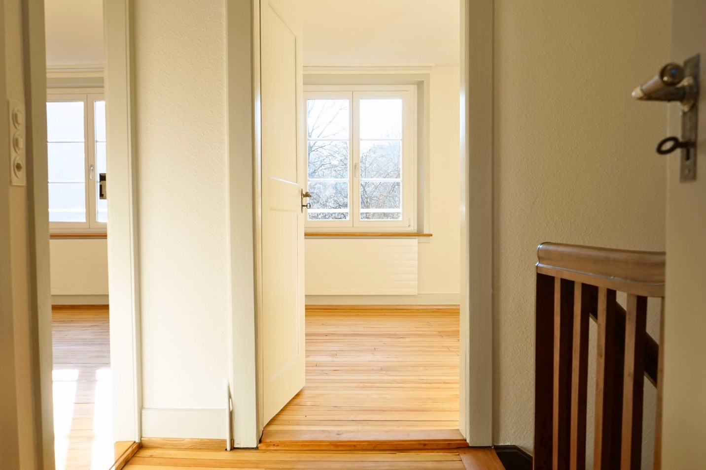 Im Rahmen der Sanierung wurde das Dachgeschoss ausgebaut, ein neues Badezimmer sowie eine kontrollierte Wohnungslüftung eingebaut. Zudem wurde die Kellerdecke gedämmt und sämtliche Fenster ersetzt. Wo möglich, wurden die bestehenden Holz-Riemenböden freigelegt, geschliffen und versiegelt. Dadurch bleibt der ursprüngliche Charme des Gebäudes erhalten und wird gezielt betont.