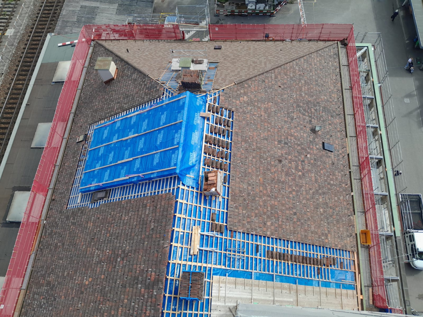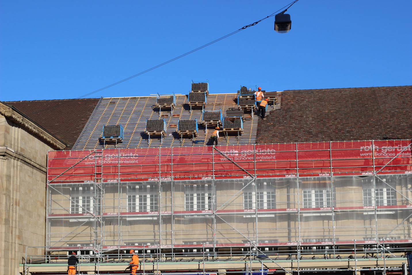 Die Dachsanierung des denkmalgeschützten Badischen Bahnhofs ist eine Mammutaufgabe: 5.900 m2 Dachfläche, die in drei Etappen saniert und ertüchtigt werden. Das sind allein 230.000 Biberschwanzziegel, die ausgedeckt, gereinigt, zwischengelagert und nach Abschluss der Sanierungsarbeiten wieder eingedeckt werden.