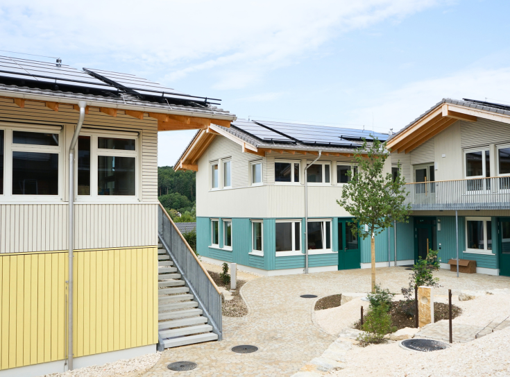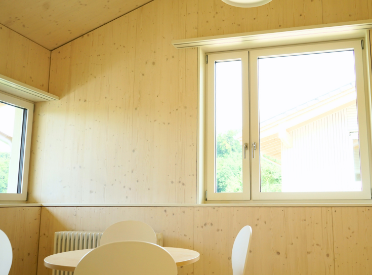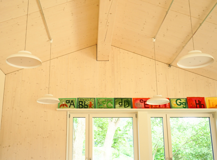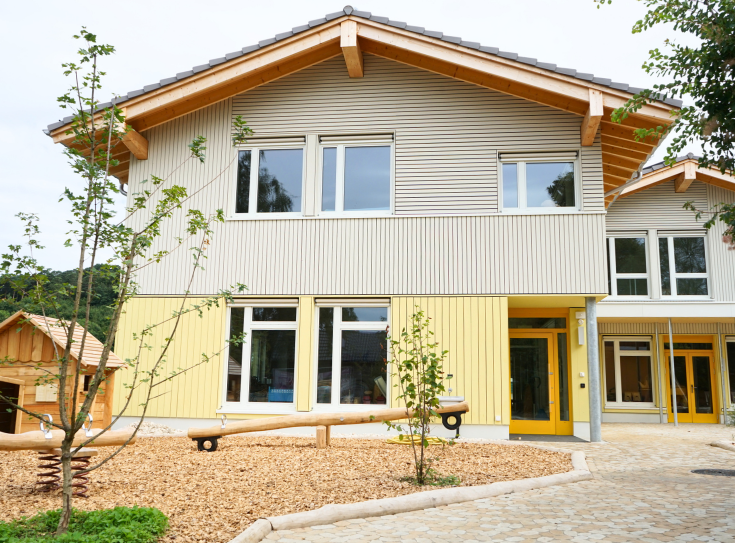 Beim Ersatzneubau eines Kindergartens in Holzelementbauweise und beim Montagebau des neuen Begegnungszentrums in unmittelbarer Nähe wurden durch die Sparte Holzbau ebenso umfassende Leistungen im Bereich der Holzverkleidung ausgeführt. Der Leistungsumfang umfasste die Holzelementbauweise sowie die Fassadenbekleidung und die innere Wandbekleidung aus Holz, die beide sowohl funktionale als auch gestalterische Anforderungen erfüllen.